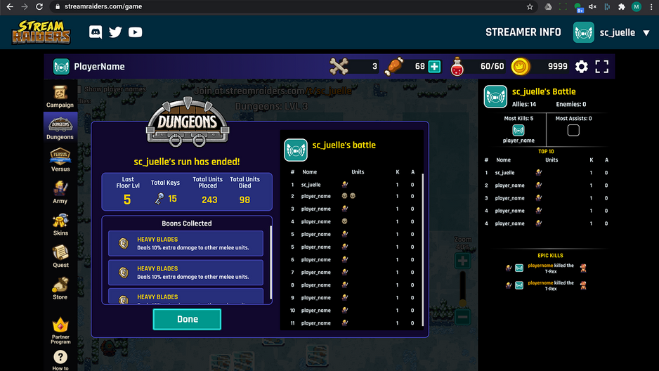 A streamer-led community battle game where streamers play live with their viewers on Twitch! The game can be played both as a main game or as a side game alongside the streamers main content with battles taking place every 30 minutes.
